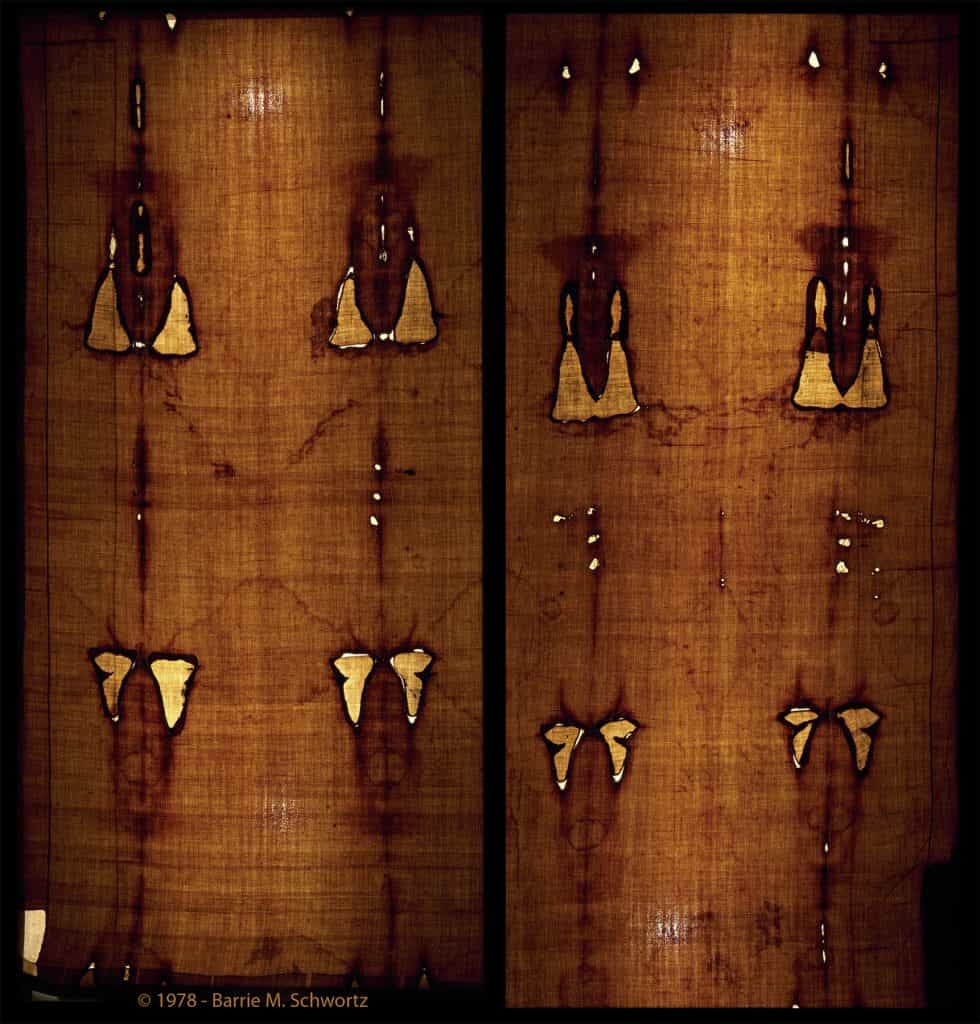 En esta fotografía de la Síndone por transparencia (B. Schwortz, 1978) puede observarse cómo la imagen es muy superficial. Únicamente tienen más consistencia las manchas de sangre, que han debido producirse por contacto directo.